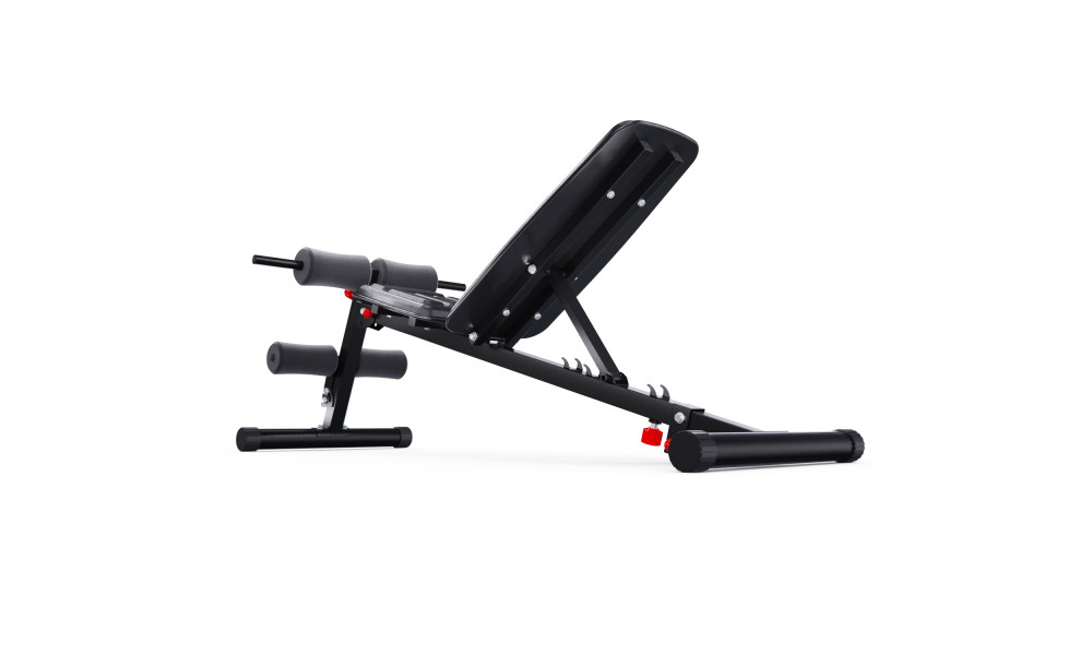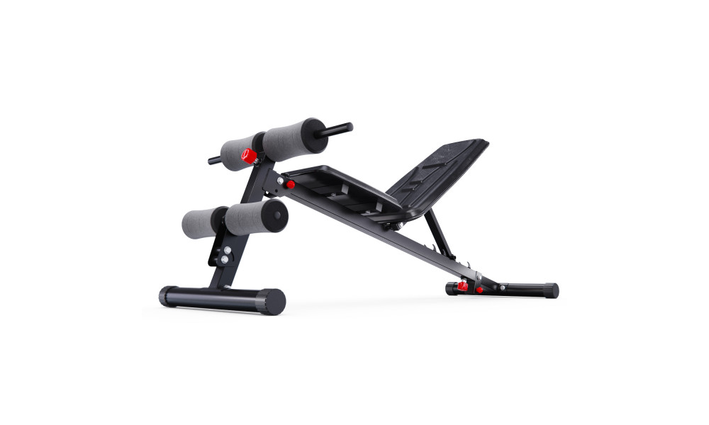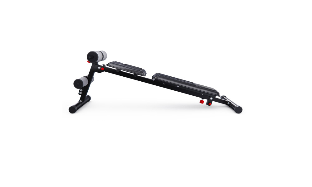 Валики из вспененного материала регулируются на 8 уровней по высоте и обеспечивают надёжную фиксацию во время тренировки. Большие ножки скамьи для фитнеса прорезинены по всей площади, чтобы защитить пол, а противоскользящая конструкция всегда обеспечивает устойчивое положение. Скамья также имеет складную и компактную конструкцию, чтобы сэкономить место в доме.